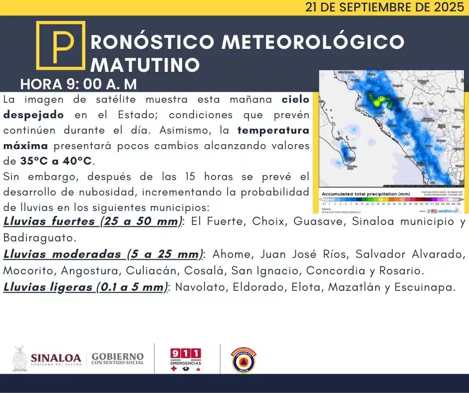 Aunque en la mañana no se anticipan lluvias, Protección Civil Sinaloa advierte que por la tarde podrían generarse lloviznas moderadas de corta duración.