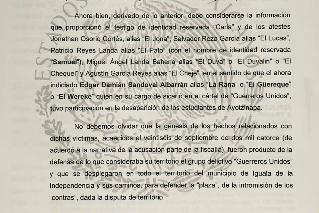 La argumentación de la jueza Raquel Duarte en el auto de formal prisión a Sandoval Albarrán se basa en la versión de la FGR de que la desaparición de los estudiantes ocurrió porque Guerreros Unidos buscaba defender la “plaza”, sin mencionar otras hipótesis. (Especial)