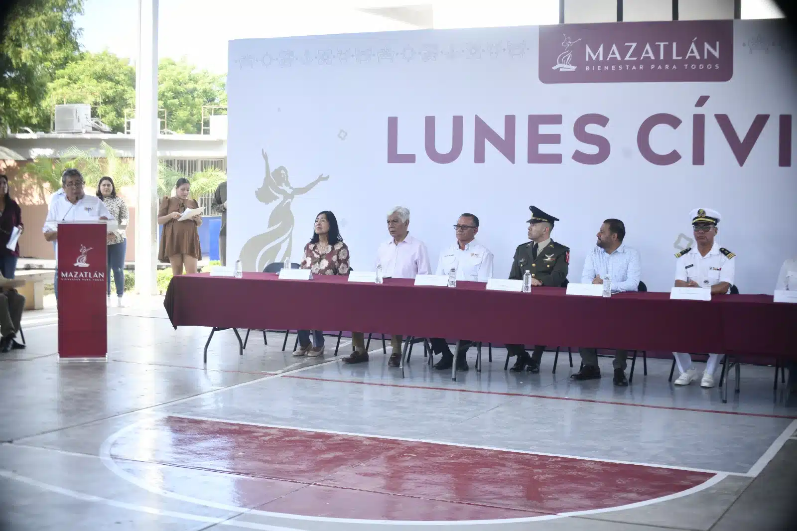 Mazatlán, Sin.– El Gobierno de Mazatlán promueve entre los estudiantes de las diversas escuelas del municipio los valores a la enseña patria, a través de los Lunes Cívicos, enfatizó el Secretario del Ayuntamiento, Moisés Ríos Pérez, quien asistió en representación de la Presidenta Estrella Palacios Domínguez, a dicha ceremonia cívica realizada en la Escuela Secundaria Federal número 8 Bicentenario de la Independencia, en el fraccionamiento Villas del Sol.