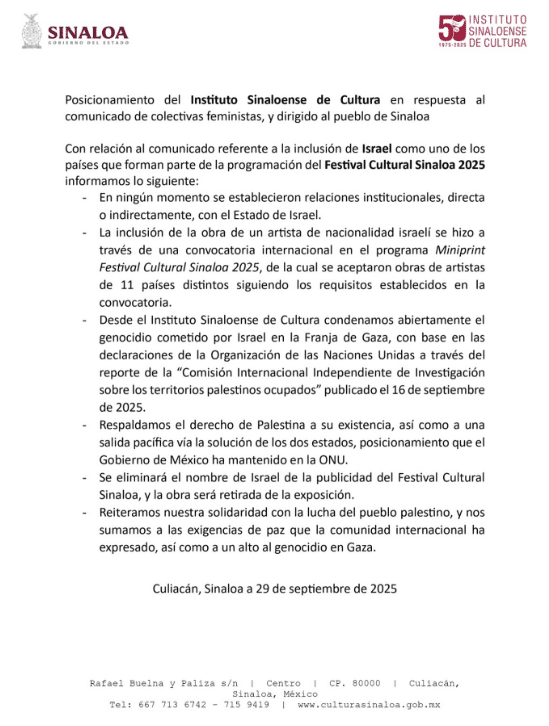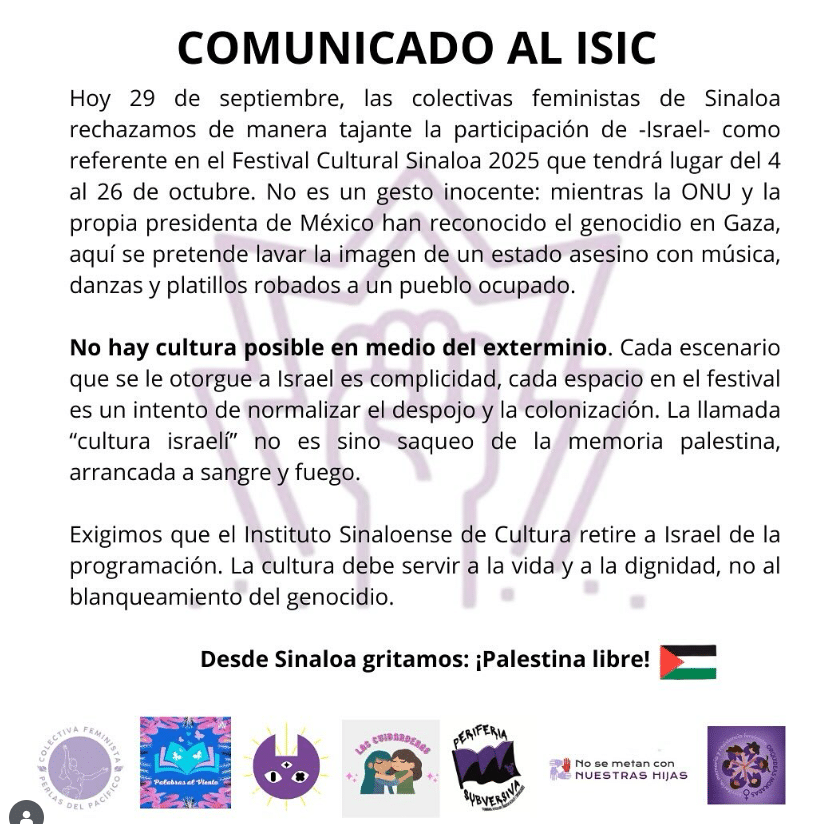 Culiacán, Sin.– La presión social ejercida por colectivas feministas en Sinaloa derivó en la eliminación de Israel de la programación oficial del Festival Cultural Sinaloa 2025, que se celebrará del 4 al 26 de octubre en los 20 municipios de la entidad.