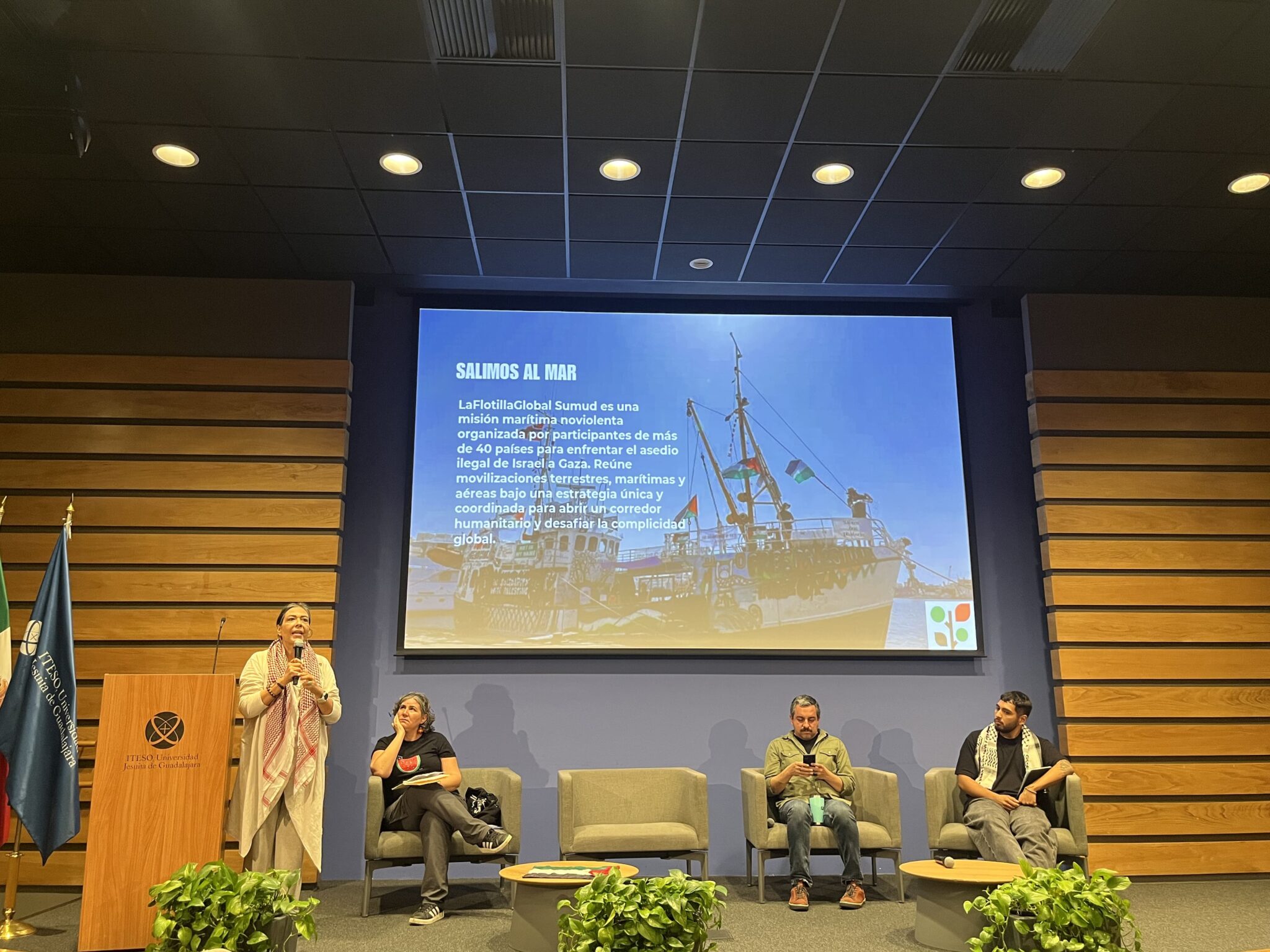 Por su parte, Dolores Pérez Lazcarro, académica del ITESO y activista en la Global Flotilla Sumud, relató su experiencia en el Global Movement to Gaza, una iniciativa internacional conformada inicialmente por más de 80 países, con el objetivo de romper el cerco impuesto a la Franja de Gaza. Explicó que este movimiento nació de una marcha en Egipto y más tarde se articuló en el mar, mediante la flotilla integrada por barcos de diferentes regiones, entre ellos Nusantara desde Malasia y otras embarcaciones de la Freedom Flotilla.