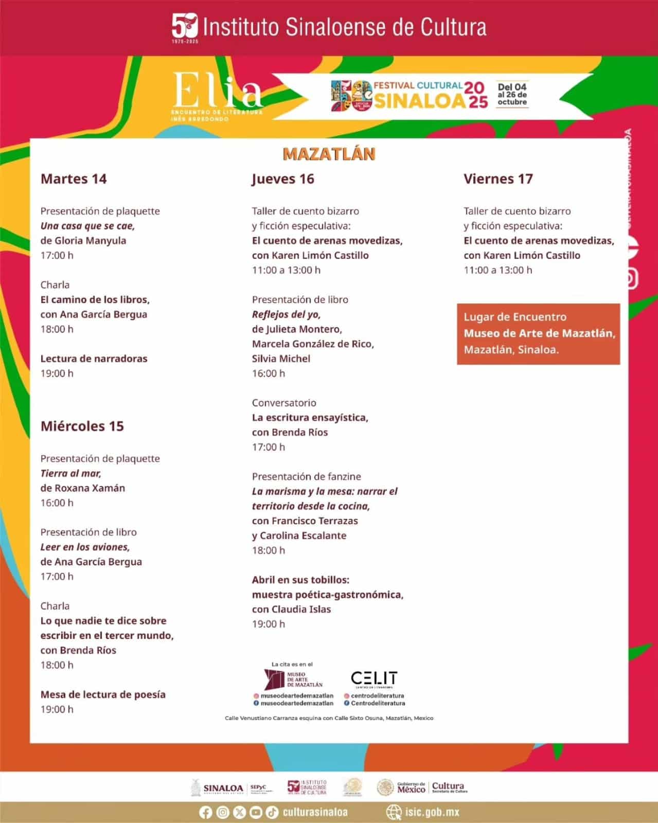 Culiacán, Sinaloa. – Del 7 al 17 de octubre se celebrará la cuarta edición del Encuentro de Literatura Inés Arredondo (ELIA 2025), que este año expandirá su presencia a tres ciudades de Sinaloa: Culiacán, Los Mochis y Mazatlán.