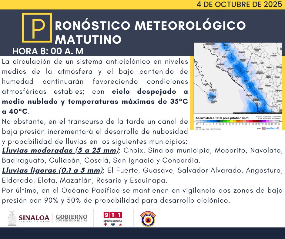 Mazatlán, Sin.– Este sábado 4 de octubre Mazatlán vivirá una jornada marcada por el calor y la probabilidad de lluvias ligeras durante la tarde, de acuerdo con el pronóstico meteorológico emitido por la Coordinación Estatal de Protección Civil.