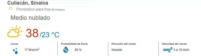 El Servicio Meteorológico Nacional (SMN) en su pronóstico informó que este día en Culiacán se espera un cielo despejado por la mañana y medio nublado por la tarde, el viento soplará en dirección noreste a una velocidad de entre 5 y 10 km/h, con ráfagas de hasta 26 km/h.