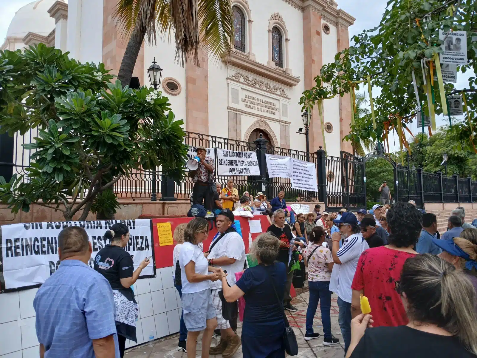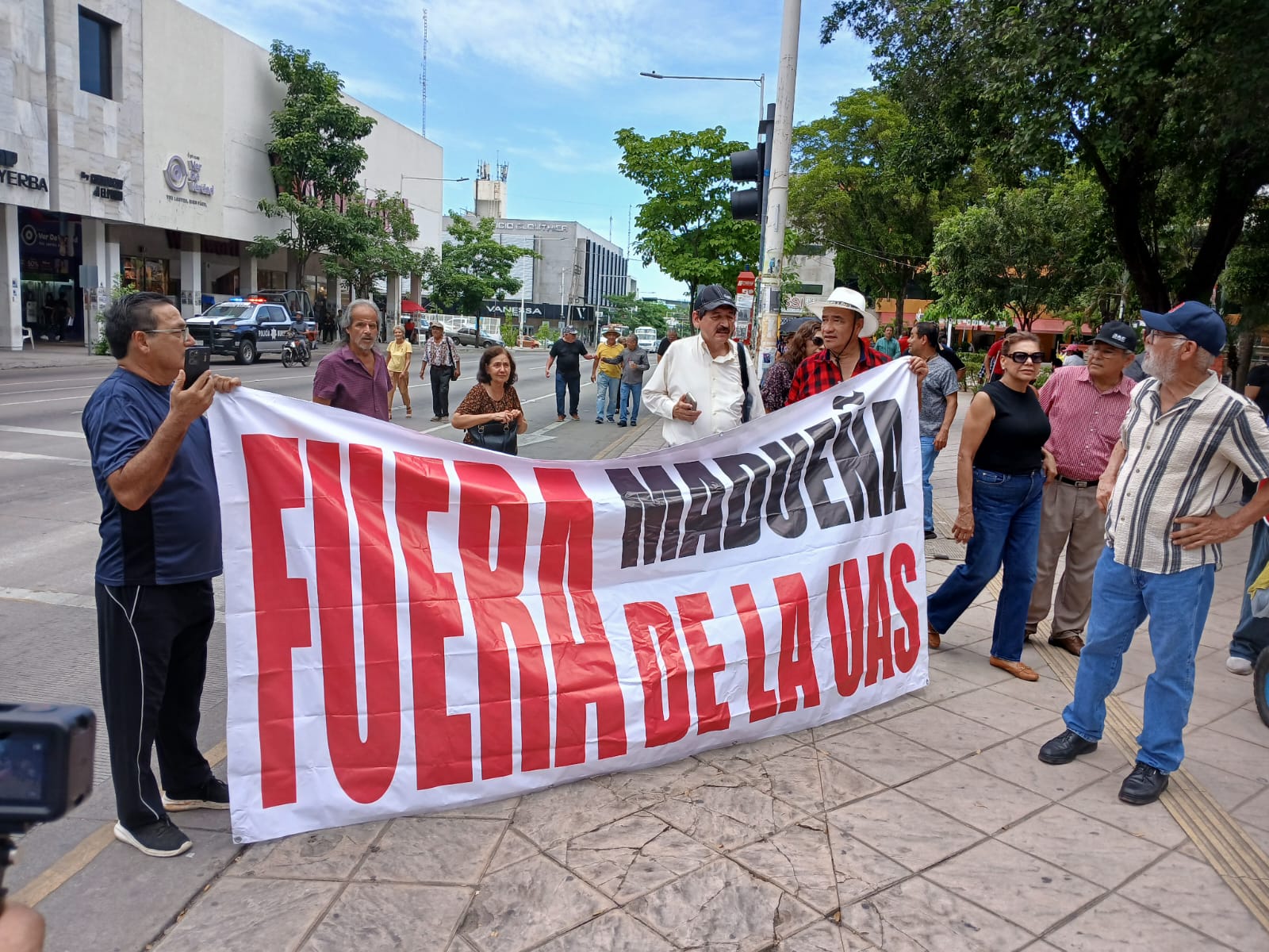 Culiacán, Sin.- Un grupo de trabajadores y jubilados de la Universidad Autónoma de Sinaloa (UAS) se manifestaron en la catedral de Culiacán, en contra de la reingeniería que promueve el rector Jesús Madueña Molina.