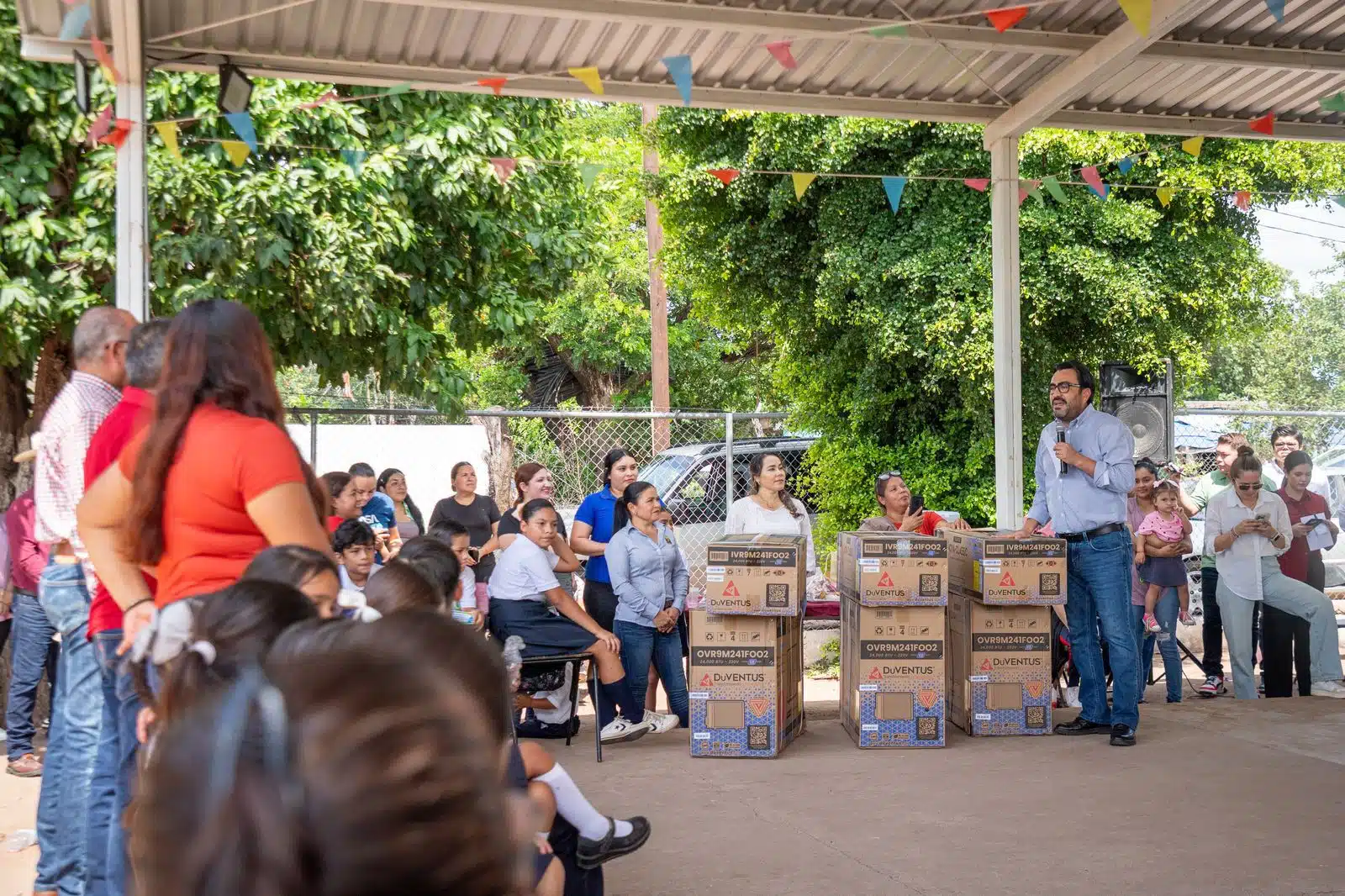 Culiacán, Sin.- En cumplimiento de los compromisos asumidos durante la entrega de la obra del puente vehicular en Casas Blancas, el alcalde Juan de Dios Gámez Mendívil regresó cuatro meses después a la comunidad para entregar el equipamiento del sistema de aire acondicionado en la escuela primaria local.