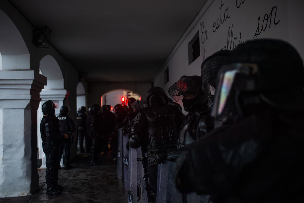 Policías y militares instantes previos en la Plaza de Santo Domingo durante la represión policial. Quito. Fotografía: Josué Araujo.