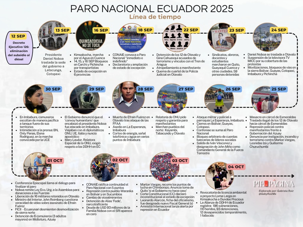 Línea de tiempo desde el 12 de septiembre hasta el 04 de octubre de 2025. Inició con la eliminación del subsidio al diésel y actualmente, se registran 196 vulneraciones, 110 heridos, 93 detenciones, 12 desaparecidos temporalmente, 1 fallecido, informó la Alianza de Organizaciones por los Derechos Humanos @DDHH_Alianza