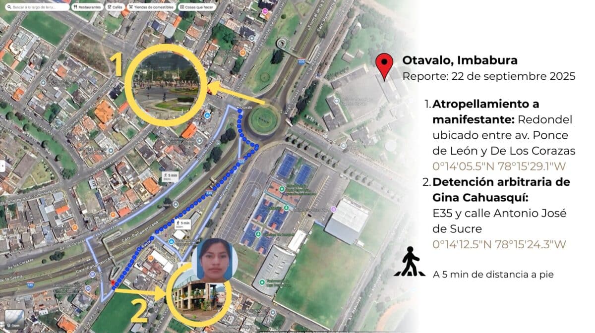Con el uso de coordenadas se verificó que el 22 de septiembre dos hechos se produjeron a una distancia de menos de 5 minutos a pie: el atropellamiento de un manifestante y la detención arbitraria de Gina Cahuasquí.