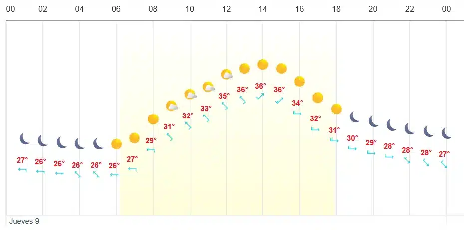 De acuerdo con el Sistema Nacional de Meteorológico (SMN), la temperatura máxima en la ciudad podría llegar a los 36 grados, mientras que por la noche no se espera que baje de los 27 grados.