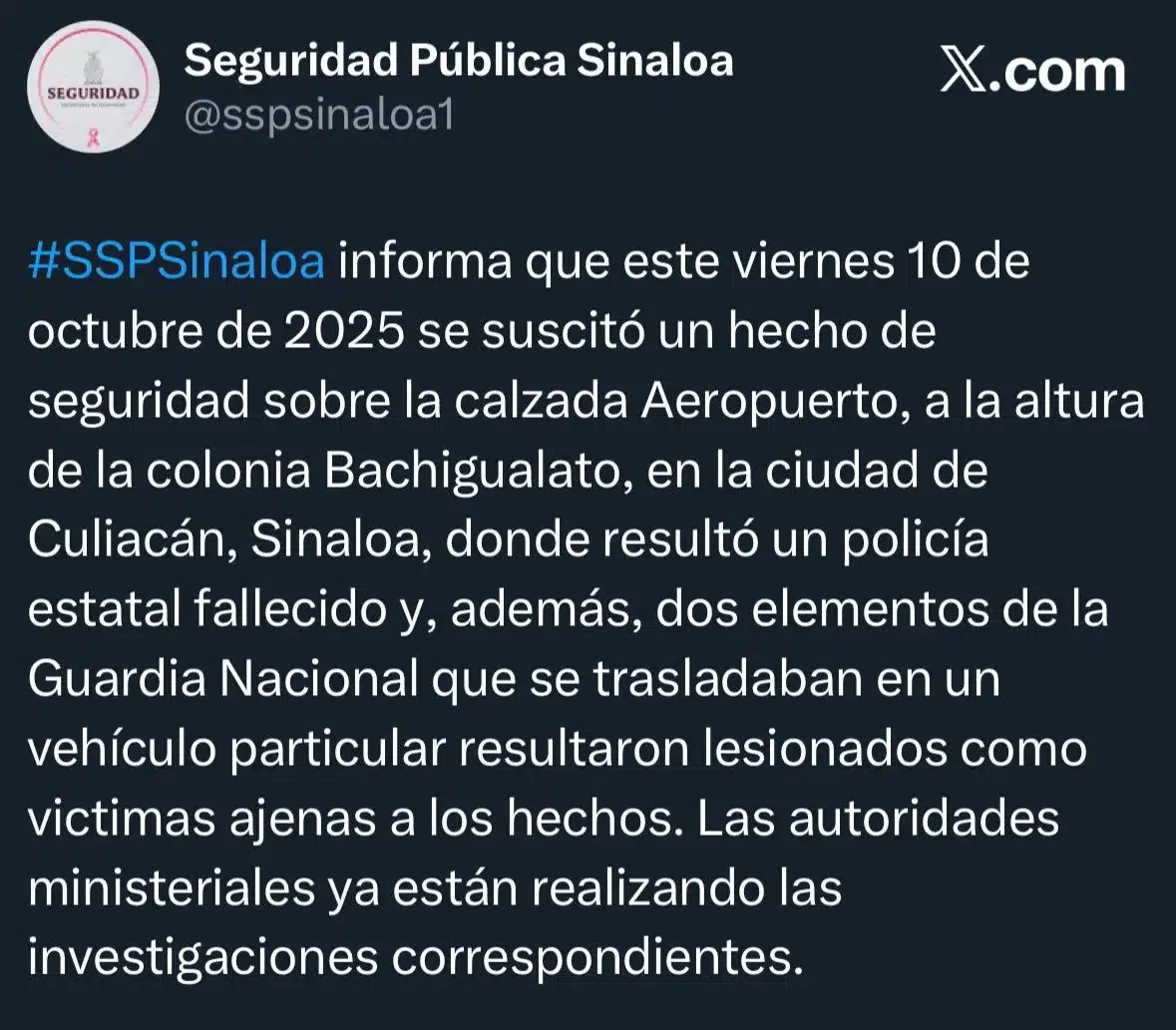 Culiacán, Sinaloa.- Al ser cuestionada sobre los hechos de seguridad registrados esta mañana en la calzada Aeropuerto, en Culiacán, donde dos elementos de la Guardia Nacional resultaron heridos y un policía estatal fue asesinado, la Mesa de Vocería de Seguridad del Gobierno del Estado de Sinaloa se limitó a leer la información difundida en redes sociales y señaló que los detalles deben ser proporcionados por las autoridades competentes.
