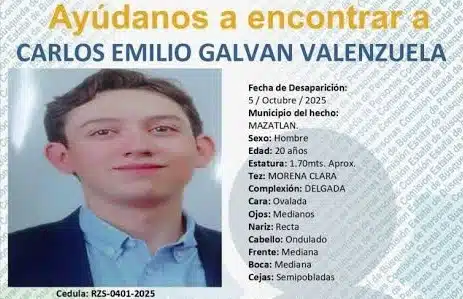 Mazatlán, Sinaloa.– La Fiscalía General del Estado de Sinaloa informó que inició una carpeta de investigación por la desaparición de Carlos Emilio “N”, originario de Guadalupe Victoria, Durango, ocurrida el pasado 4 de octubre en Mazatlán.