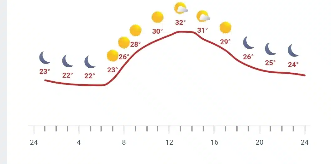 De acuerdo con el Servicio Meteorológico Nacional (SMN), durante el día el termómetro podría alcanzar los 31 °C, mientras que por la noche descenderá ligeramente hasta los 25 °C, manteniendo un ambiente cálido y húmedo.