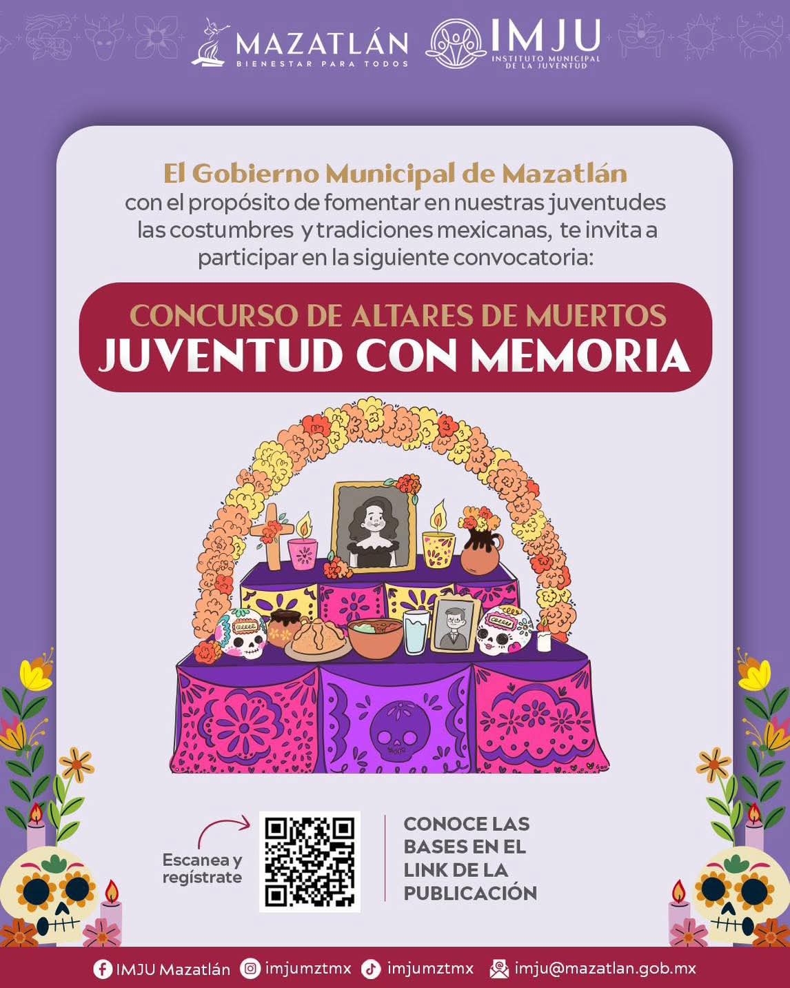 Mazatlán, Sin.- Con el propósito de preservar las tradiciones mexicanas y fortalecer el tejido social a través de la participación juvenil, el Gobierno Municipal de Mazatlán, que encabeza la Presidenta Estrella Palacios Domínguez, a través del Instituto Municipal de la Juventud (IMJU), lanzó la convocatoria para el Concurso de Altares y Catrinas 2025, invitando a las y los jóvenes del municipio a ser parte de esta expresión cultural.