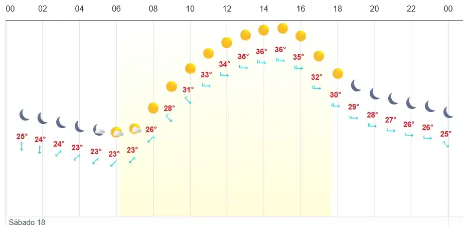 De acuerdo con el Servicio Meteorológico Nacional (SMN), se prevé que la temperatura máxima alcance los 36 grados Celsius alrededor del mediodía, mientras que la temperatura mínima rondará los 22 grados Celsius durante la noche. No se prevén lluvias, y el cielo se mantendrá despejado en la mayor parte del día, con condiciones estables y sin cambios significativos.