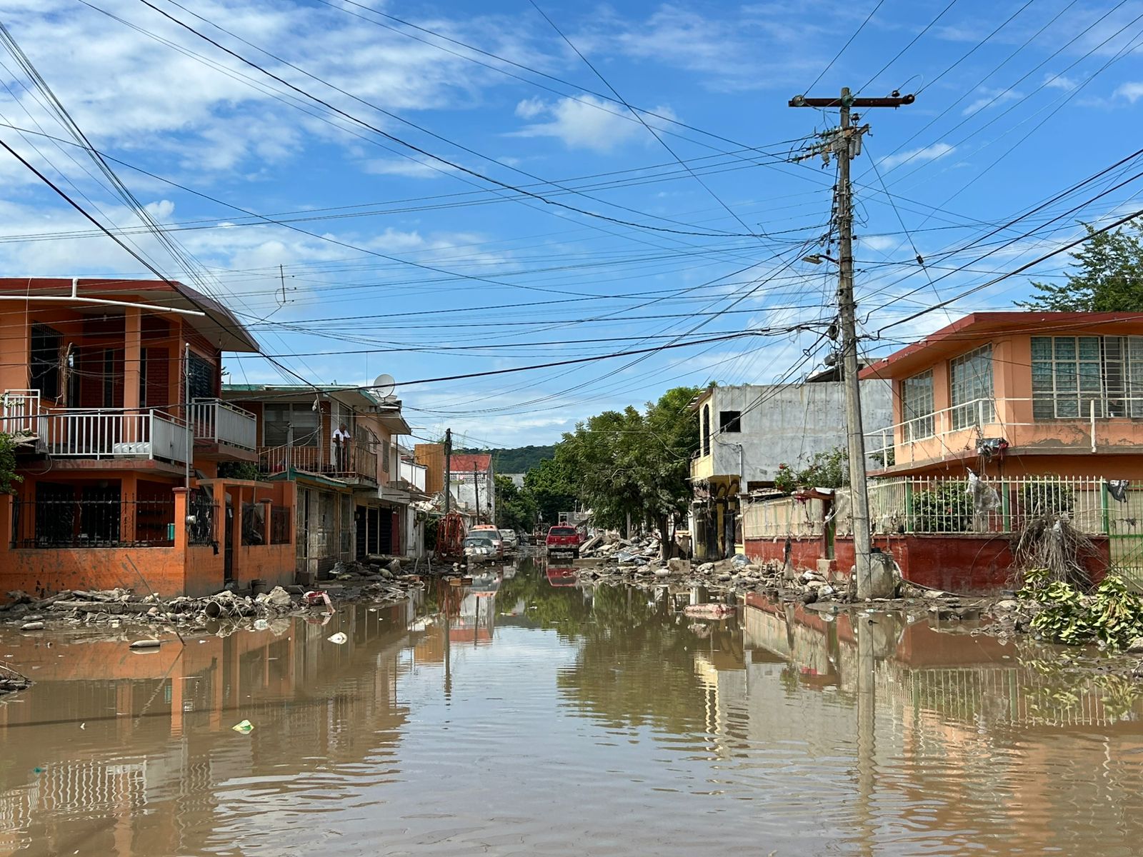 En calles de esta colonia, el Grupo Rescate Internacional Topos cortó varios árboles y retiró láminas que estaban salpicados por el chapopote, esto como método preventivo para evitar intoxicaciones o un posible incendio pues la fuerza del agua rompió cables de luz que de pronto chispean.
