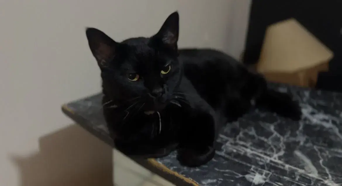 Lucifer, un gatito negro de 10 años, recostado sobre un mueble / Foto: Angélica Villegas