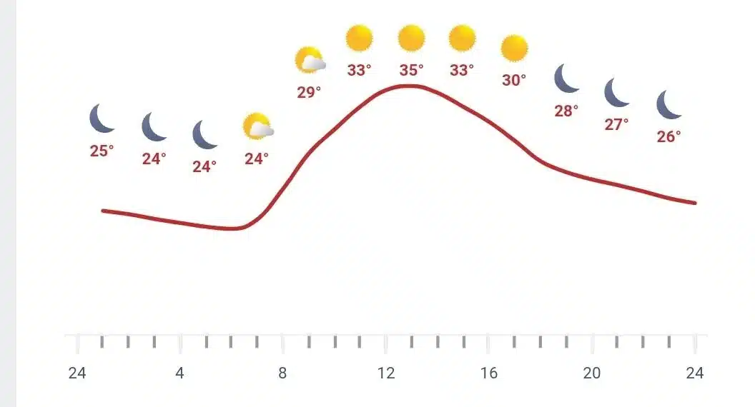Durante el medio día, se espera que el termómetro ascienda hasta los 35 grados, mientras que por la noche las temperaturas mínimas rondarán los 24 grados centígrados, por lo que se confirma una jornada completa de temperatura cálida.