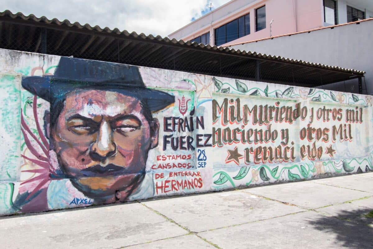 Mural en memoria de Efraín Fuérez pintado cerca de la Universidad Central del Ecuador en Quito, comunero asesinado en las movilizaciones del Paro Nacional 2025 en Imbabura. Autor: Apxel. Participó IZREAL.