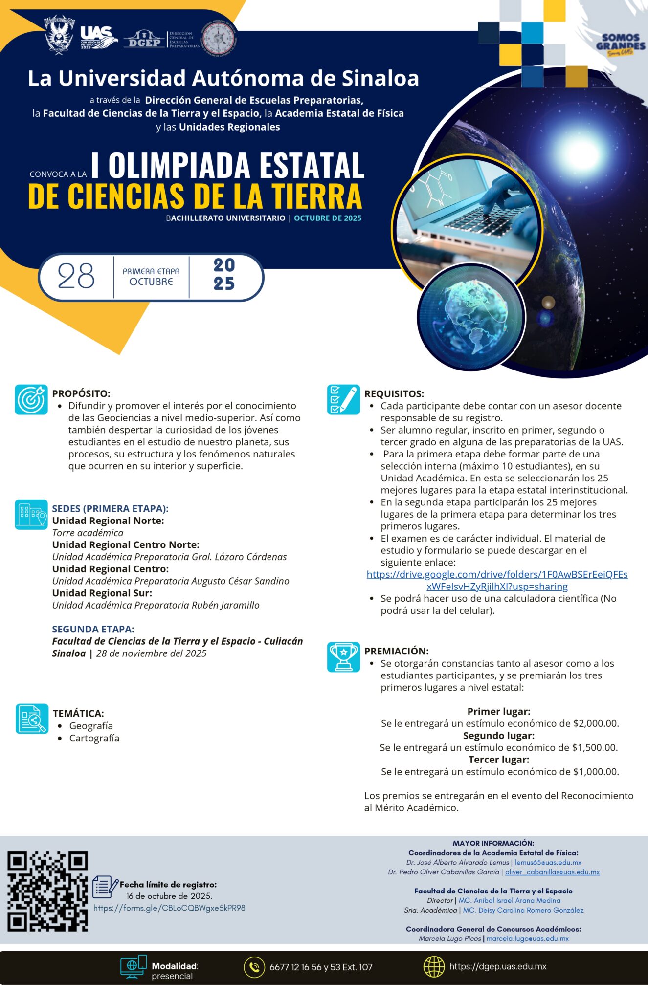 Por primera vez, la Dirección General de Escuelas Preparatorias (DGEP) de la Universidad Autónoma de Sinaloa (UAS) está convocando a todos los alumnos de los diferentes grados de bachillerato a que participen en la Olimpiada de Ciencias de la Tierra, la cual busca incentivar a las nuevas generaciones para que tengan las herramientas necesarias para la toma de decisiones informadas sobre el cuidado y preservación del medio ambiente.