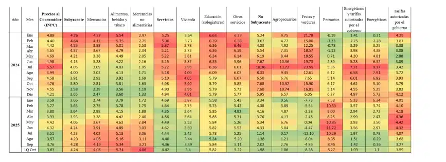 “El ajuste a la baja se explicó sobre todo por el componente no subyacente, que retrocedió del 2.02% previo a 1.58% en la primera mitad de octubre. Al interior del índice no subyacente, los agropecuarios registraron una tasa de 1.06% anual y los energéticos y tarifas autorizadas por el gobierno de 1.99% anual”, señala el informe.