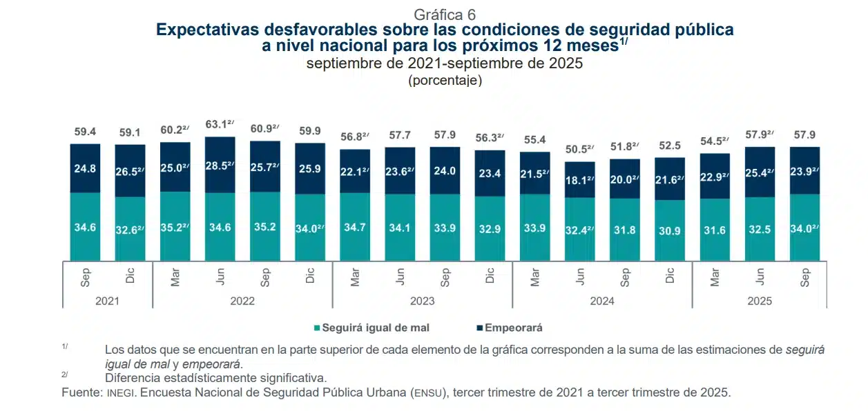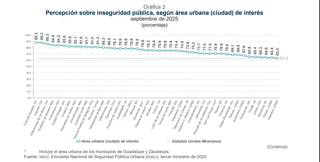 Culiacán, Sinaloa.- Culiacán continúa siendo la ciudad donde sus habitantes se sienten más inseguros, de acuerdo a la Encuesta Nacional de Seguridad Pública Urbana (ENSU) del INEGI, de septiembre de 2025.