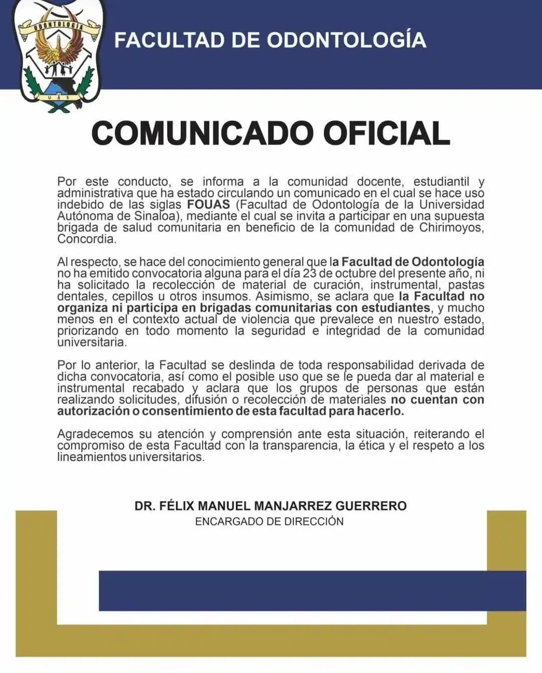 A pesar de las dificultades, la brigada se llevará a cabo con los dos dentistas restantes, ambos estudiantes del último año de la Facultad de Odontología de la Universidad Autónoma de Sinaloa (UAS). La institución, sin embargo, emitió un comunicado deslindándose de toda responsabilidad respecto a esta actividad.