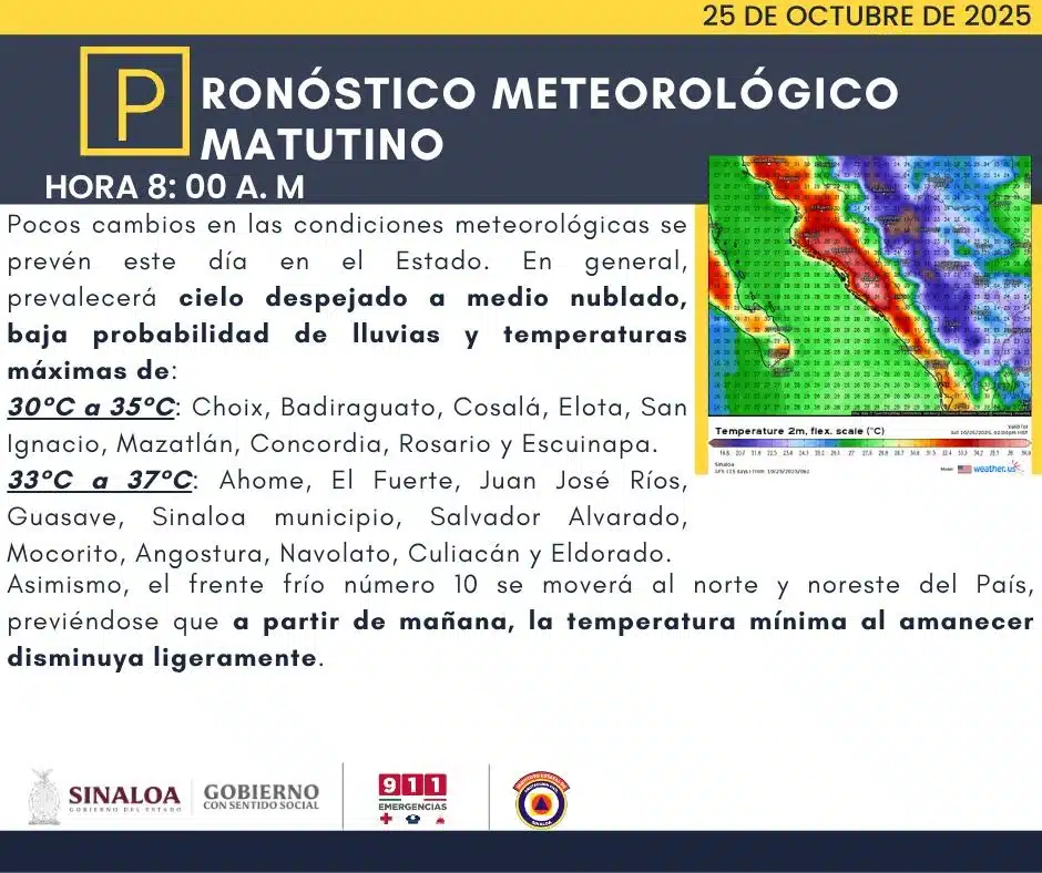 De acuerdo al Servicio Meteorológico Nacional (SMN) el pronóstico meteorológico para este sábado es de cielo despejado con intervalos de nubosidad ligera, sin probabilidad de lluvia en la región sur de Sinaloa.