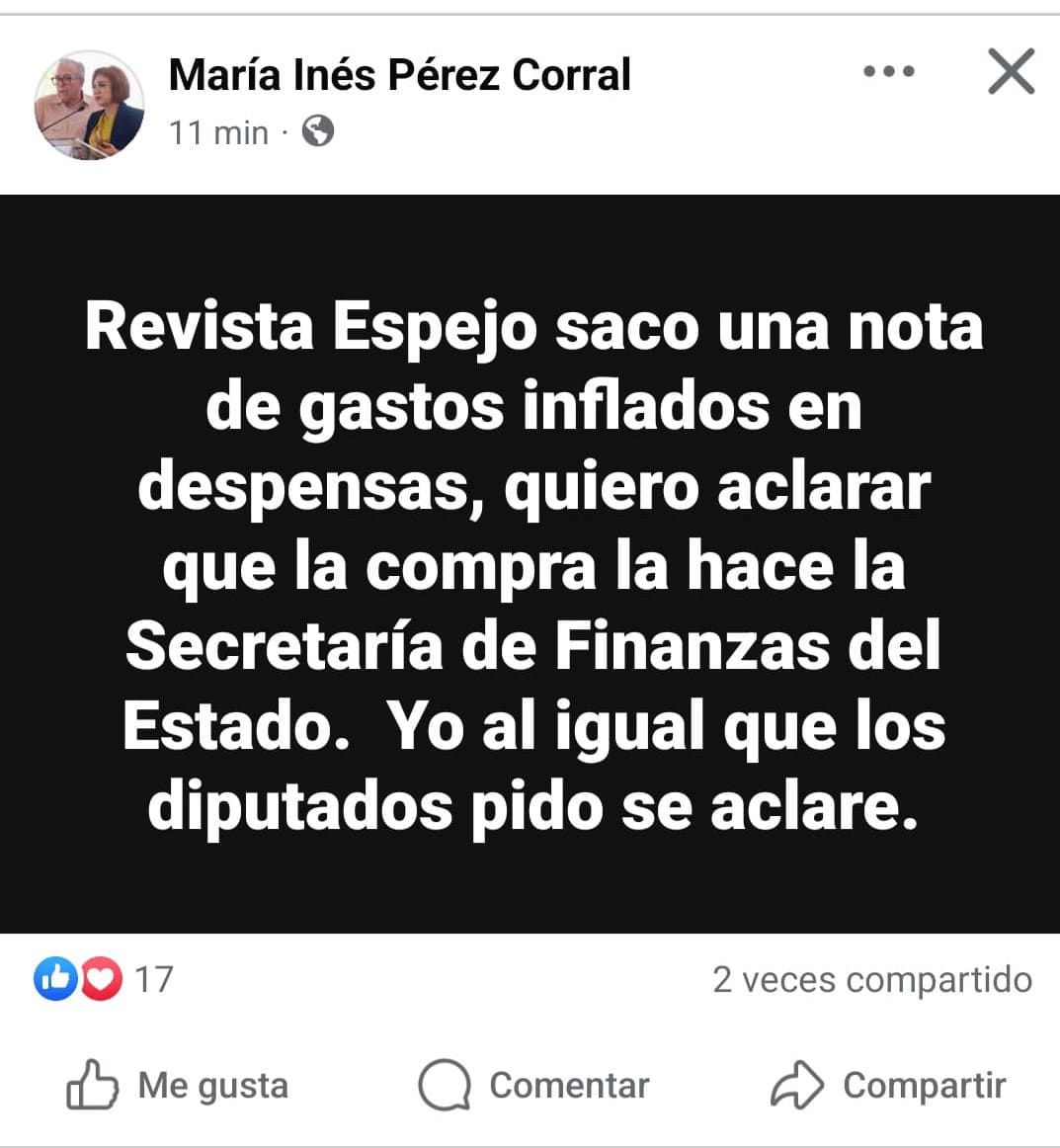 “Revista Espejo sacó una nota de gastos inflados en despensas, quiero aclarar que la compra la hace la Secretaría de Finanzas del Estado. Yo al igual que los diputados pido se aclare”, escribió en su cuenta de Facebook.