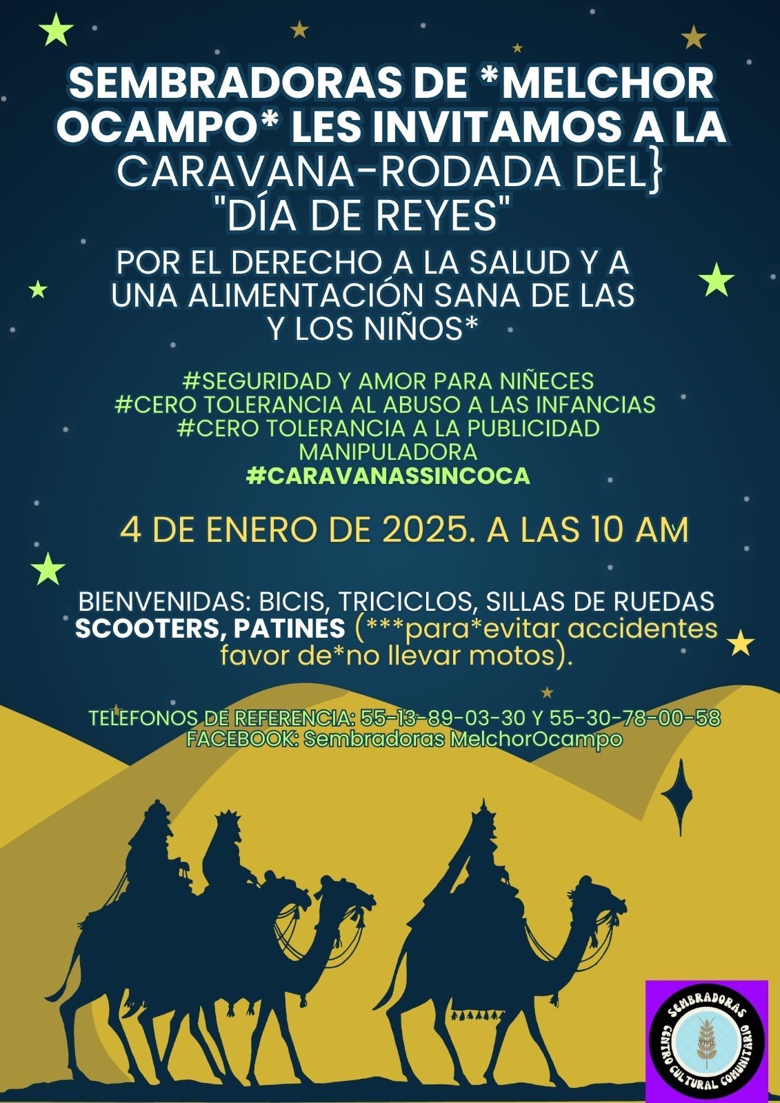 Con la intención de ofrecer una actividad decembrina que promueva prácticas saludables, el colectivo “Sembradoras” de Melchor Ocampo, en el Estado de México, propuso realizar una Caravana sin Coca Cola. La idea era contar con una ruta que las personas participantes recorrieran en bicicleta, patines, scooter o sillas de ruedas y al término de esta, poder degustar alimentos y bebidas saludables. Sin embargo, el municipio no apoyó la iniciativa y solamente realizaron el convivio.