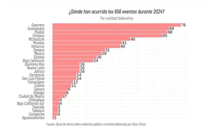 De acuerdo al recuento mensual de Data Cívica, en septiembre de 2024 hubo 38 eventos violentos de este estilo en México, de los cuales 7 se ubicaron en Sinaloa: 5 en el municipio de Culiacán y 2 en Mazatán.