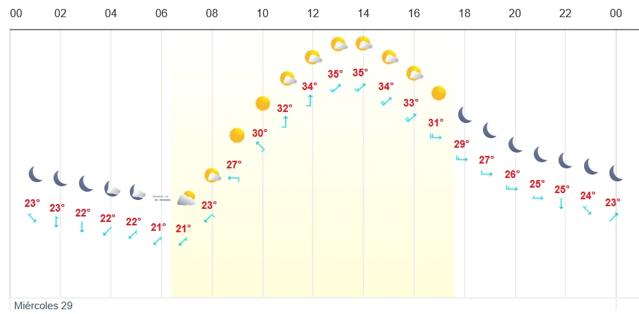 De acuerdo con el Servicio Meteorológico Nacional (SMN), para este lunes se pronostica un clima mayormente despejado y soleado, con cero probabilidad de lluvias durante todo el día. Durante el medio día, se espera que el termómetro ascienda hasta los 35 grados, mientras que por la noche las temperaturas mínimas rondarán los 21 grados centígrados, por lo que se confirma una jornada completa de temperatura cálida.