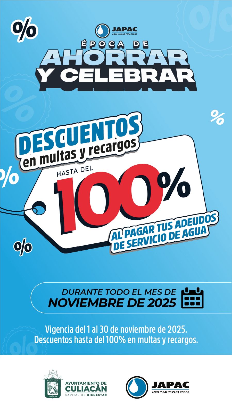 La Junta Municipal de Agua Potable y Alcantarillado de Culiacán da a conocer que, a partir del 01 de noviembre, inicia con la campaña de descuentos de hasta el 100% de descuento en multas y recargos.