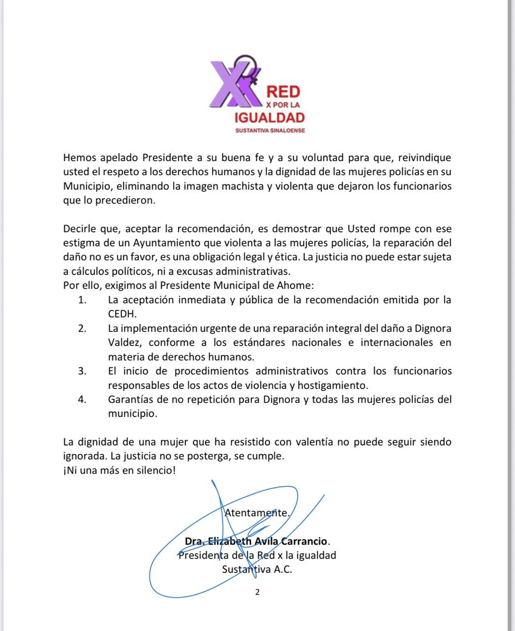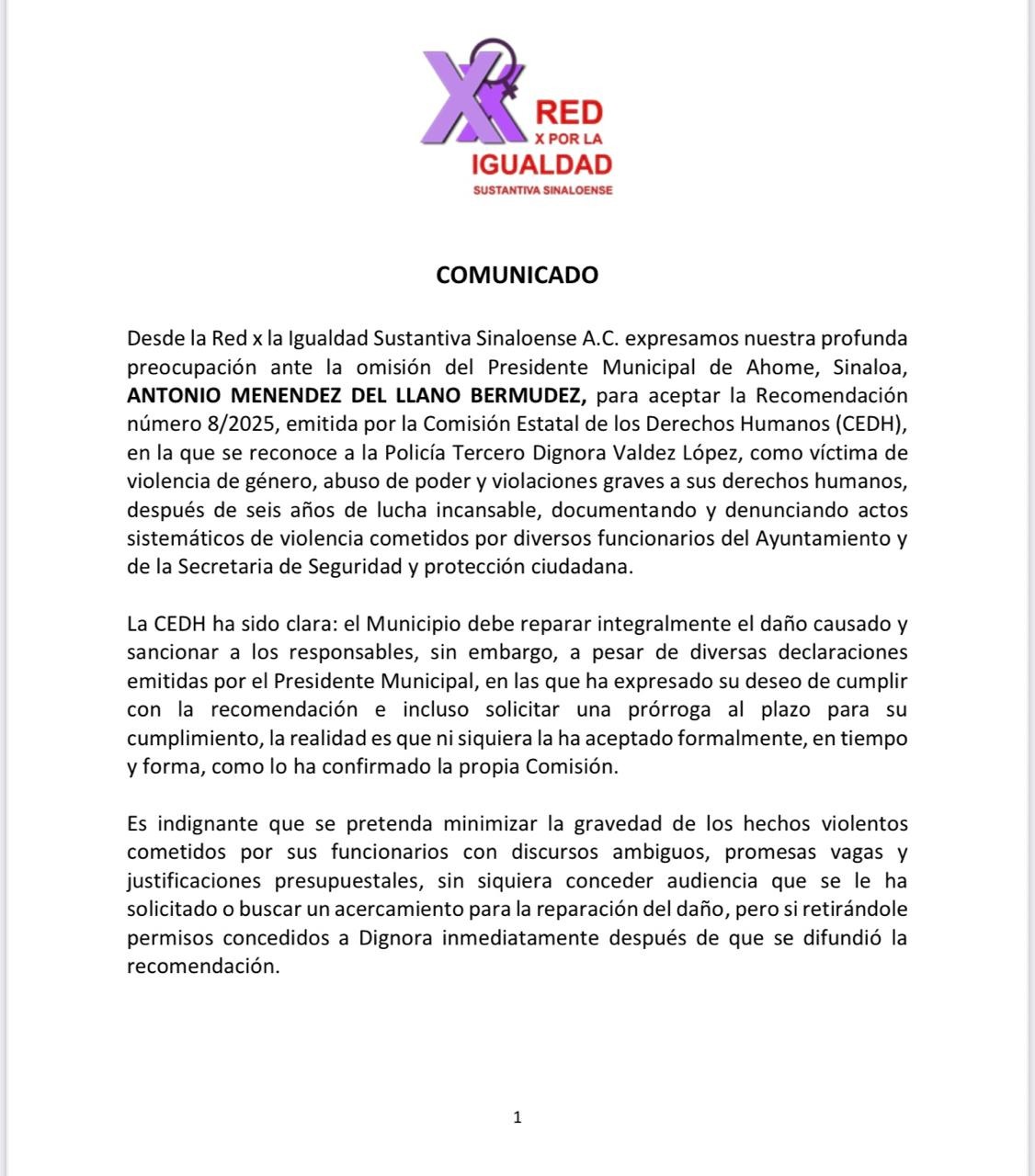 La Red por la Igualdad Sustantiva Sinaloense A.C. exigió al presidente municipal de Ahome, Antonio Menéndez del Llano Bermúdez, aceptar y cumplir la recomendación 8/2025 emitida por la Comisión Estatal de los Derechos Humanos de Sinaloa (CEDH), que reconoce a la policía tercero Dignora Valdez López como víctima de violencia de género, abuso de poder y violaciones graves a sus derechos humanos.