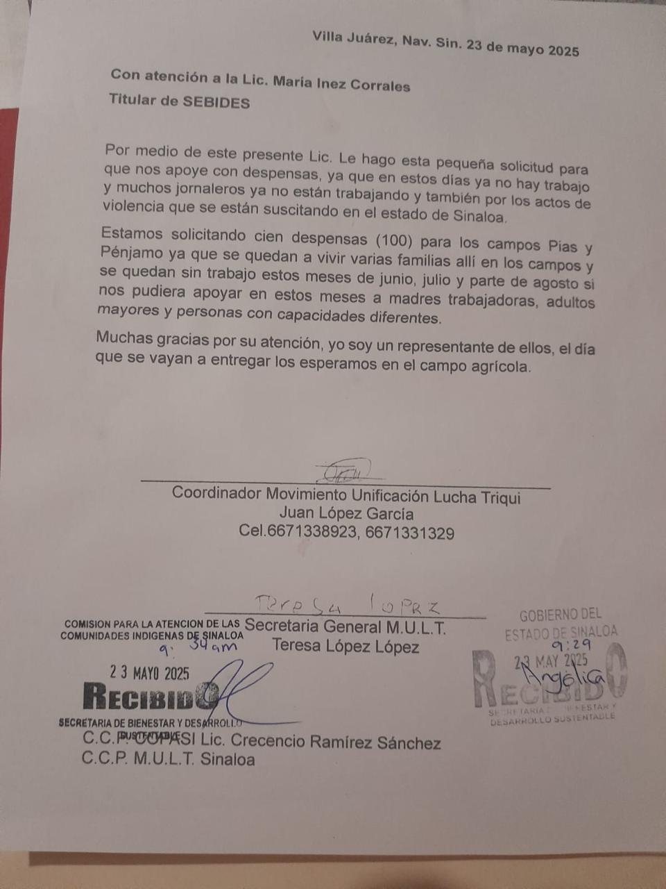 Agregó que en mayo también se solicitó a la Secretaría de Bienestar y Desarrollo Social (SEBIDES) un apoyo alimentario de al menos 100 despensas para los campos Pías y Pénjamo, pero tampoco hubo respuesta a ese oficio.