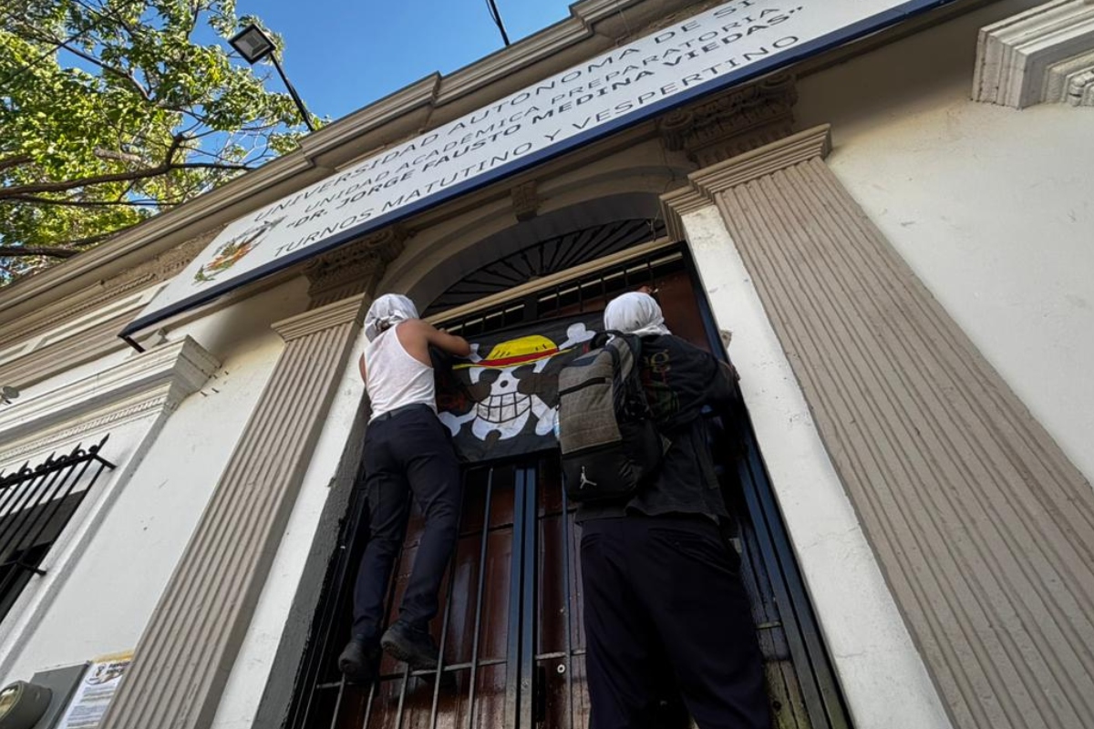 La manifestación avanzó entre el sonido de la tambora, las consignas y una bandera pirata ondeando en alto, la Jolly Roger del anime One Piece, convertida en símbolo de resistencia. Del corazón de la ciudad marcharon hacia la Preparatoria Central “Jesús Ramón Félix Valenzuela”.
