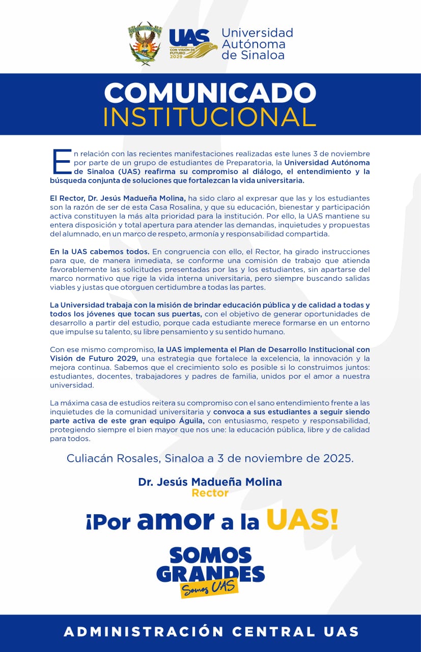 En el comunicado, firmado por el rector Jesús Madueña Molina, se expresó que las y los estudiantes son la razón de ser de la Casa Rosalina, y que su educación, bienestar y participación activa constituyen la más alta prioridad para la institución. Asimismo, reiteró la total apertura para atender las demandas, inquietudes y propuestas del alumnado dentro de un marco de respeto, armonía y responsabilidad compartida.