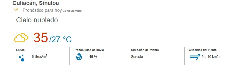 De acuerdo al pronóstico del SMN, el cielo en Culiacán estará despejado y soleado todo el día. El viento soplará dirección sureste con una velocidad de 5 a 10 km/h, y ráfagas que podrían llegar hasta los 20 km/h. Además, hay 45% de probabilidad de lluvia.