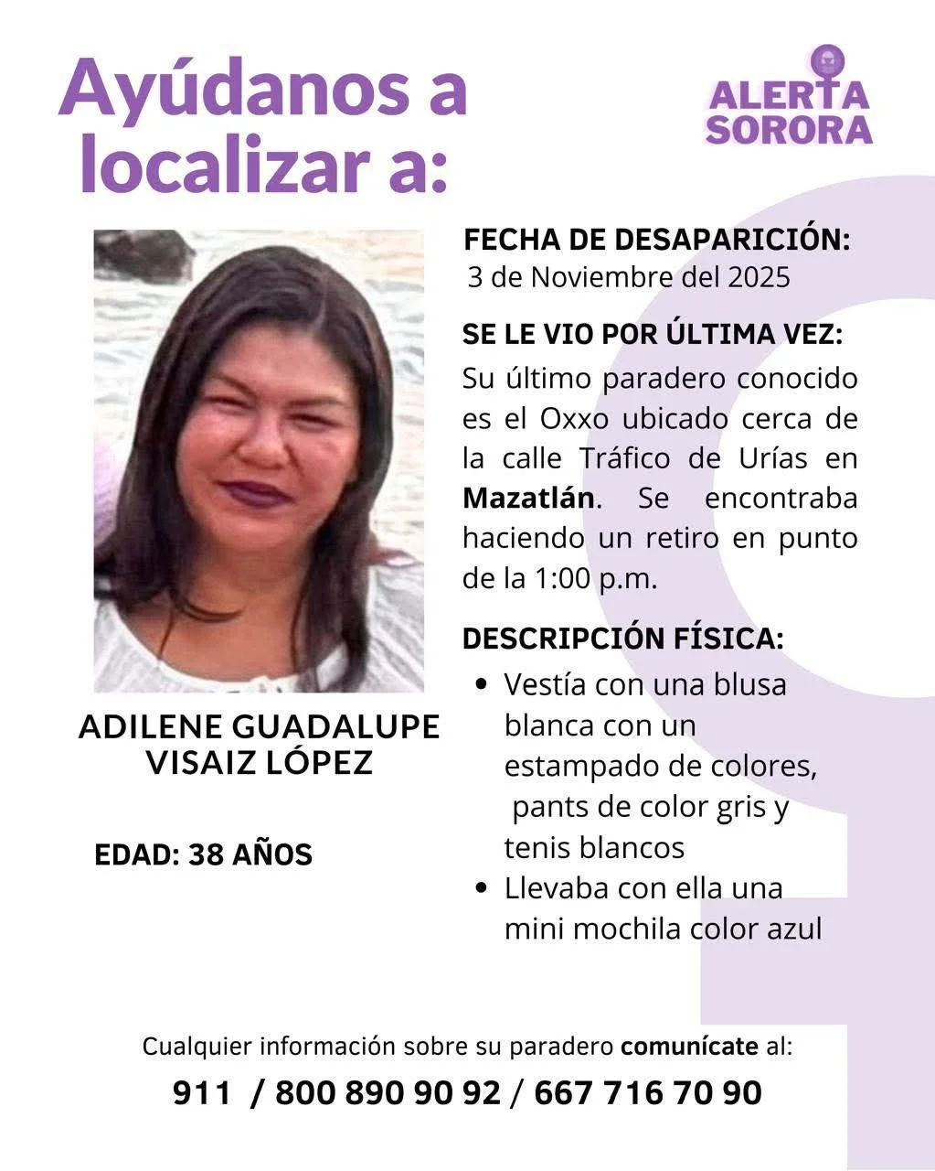De acuerdo a la ficha de búsqueda que circula en redes sociales, Adilene Visaiz salió a la 1:00 de la tarde a hacer un retiro en una tienda Oxxo ubicada por la calle Tráfico Urías, de Mazatlán, y desde entonces no ha regresado a casa.
