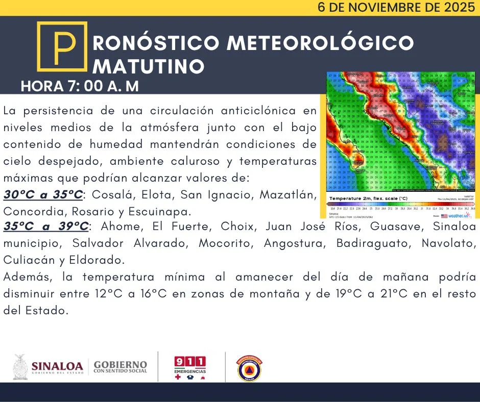 En el pronóstico del clima extendido para todo el Estado, Protección Civil de Sinaloa informó que durante este día se mantendrán condiciones atmosféricas estables con cielo despejado, ambiente caluroso y temperaturas máximas de 34°C a 39°C.