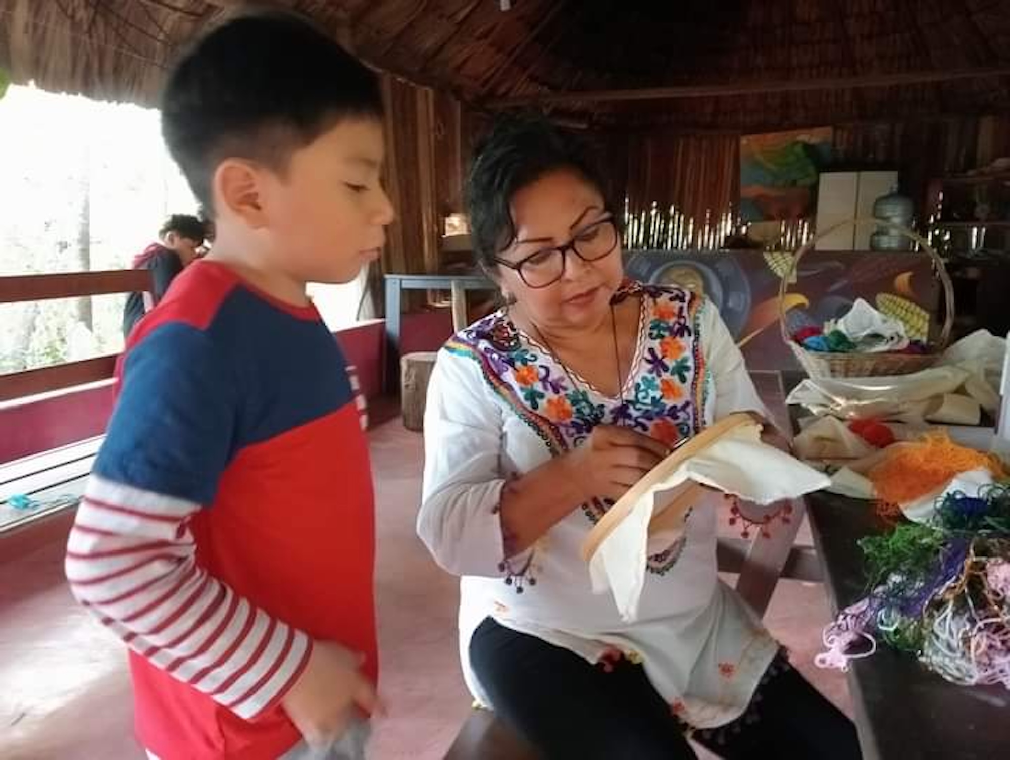 Esther Sulub Santos le muestra a Darío cómo hacer una puntada del bordado. (Ángel Sulub Santos)
