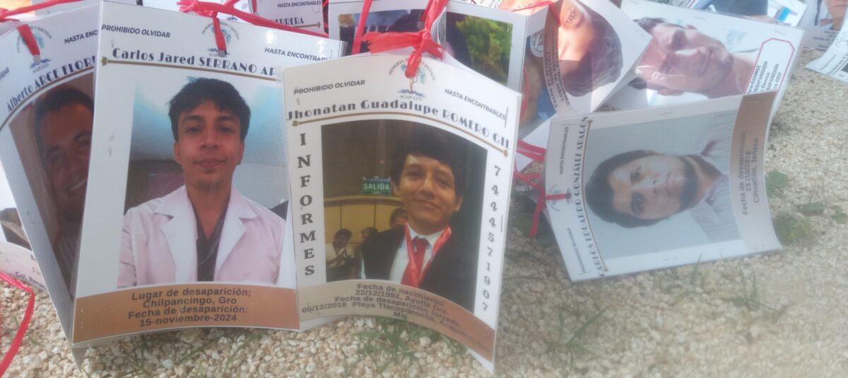 Gil Guzmán detalló que la pega y exhibición de mantas de los desaparecidos no son solo de Guerrero, sino también de entidades como Guadalajara, Morelos, Colima, Sinaloa, Monterrey, Veracruz, Ciudad de México. “Casi de todo el país, también de otros países como Colombia, Ecuador, El Salvador, que fueron desaparecidos aquí en México”.