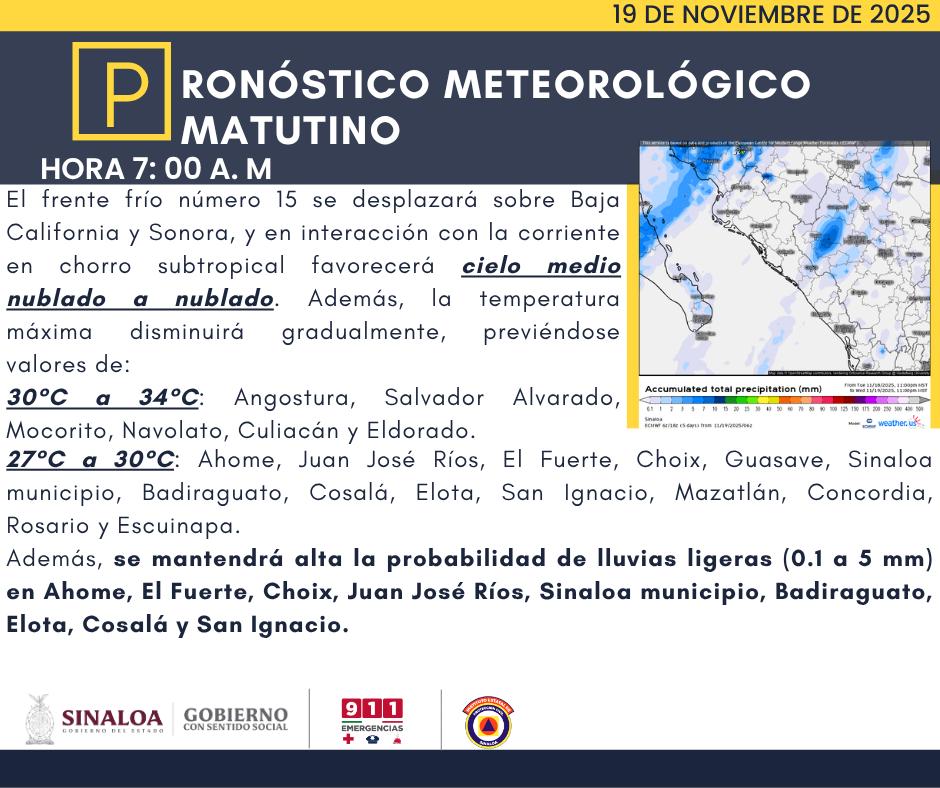 Mazatlán, Sin.- Este miércoles 19 de noviembre, Mazatlán amaneció bajo condiciones de cielo medio nublado como parte de los efectos del frente frío número 15, que continúa desplazándose sobre Baja California y Sonora. Su interacción con la corriente en chorro subtropical está generando humedad y nubosidad en gran parte del noroeste del país, incluido el sur de Sinaloa.