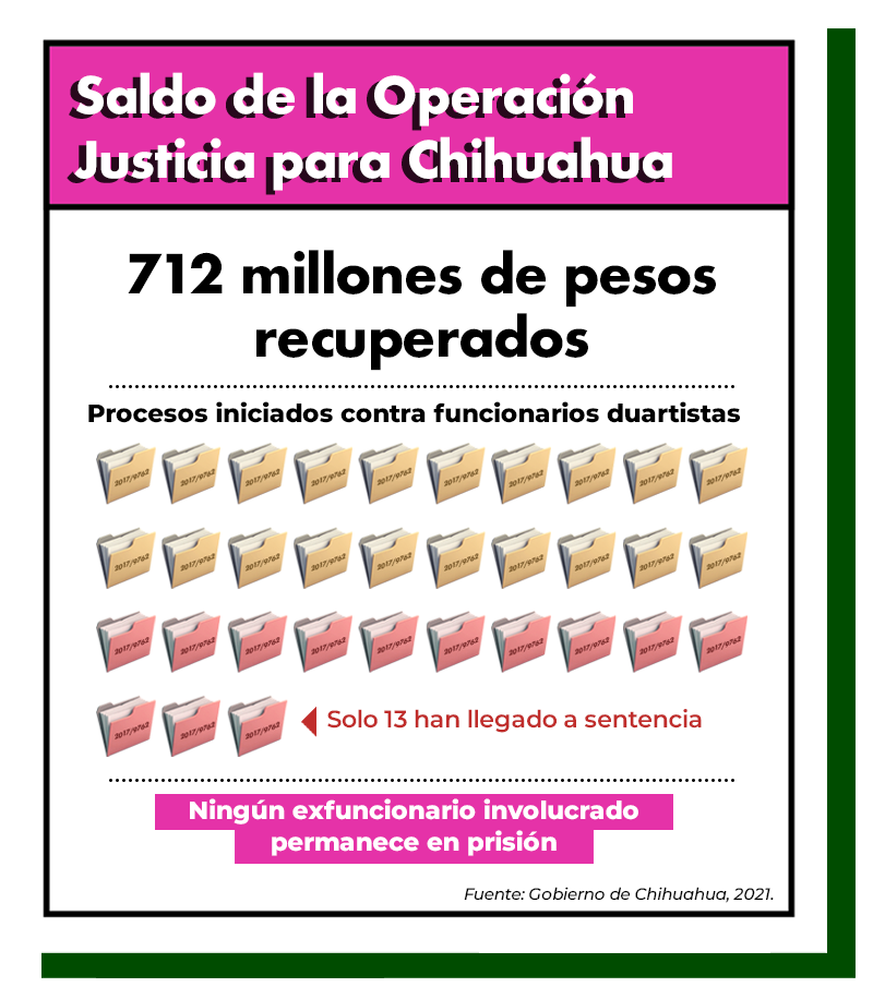 Sin embargo, los logros de la Operación Justicia para Chihuahua de Corral no fueron tan deslumbrantes como el discurso. La ineficacia también jugó a favor de Duarte. Para junio de 2021, el gobierno estatal informó que la Operación Justicia para Chihuahua había recuperado apenas 712 millones de pesos. Hacia finales de 2024, de los 33 procesos penales iniciados por corrupción a excolaboradores de Duarte, solo 13 habían llegado a sentencia y el resto permanece sin conclusión, informó el TSJ en respuesta a una solicitud de información. Actualmente, ninguno de esos exfuncionarios permanece en prisión.