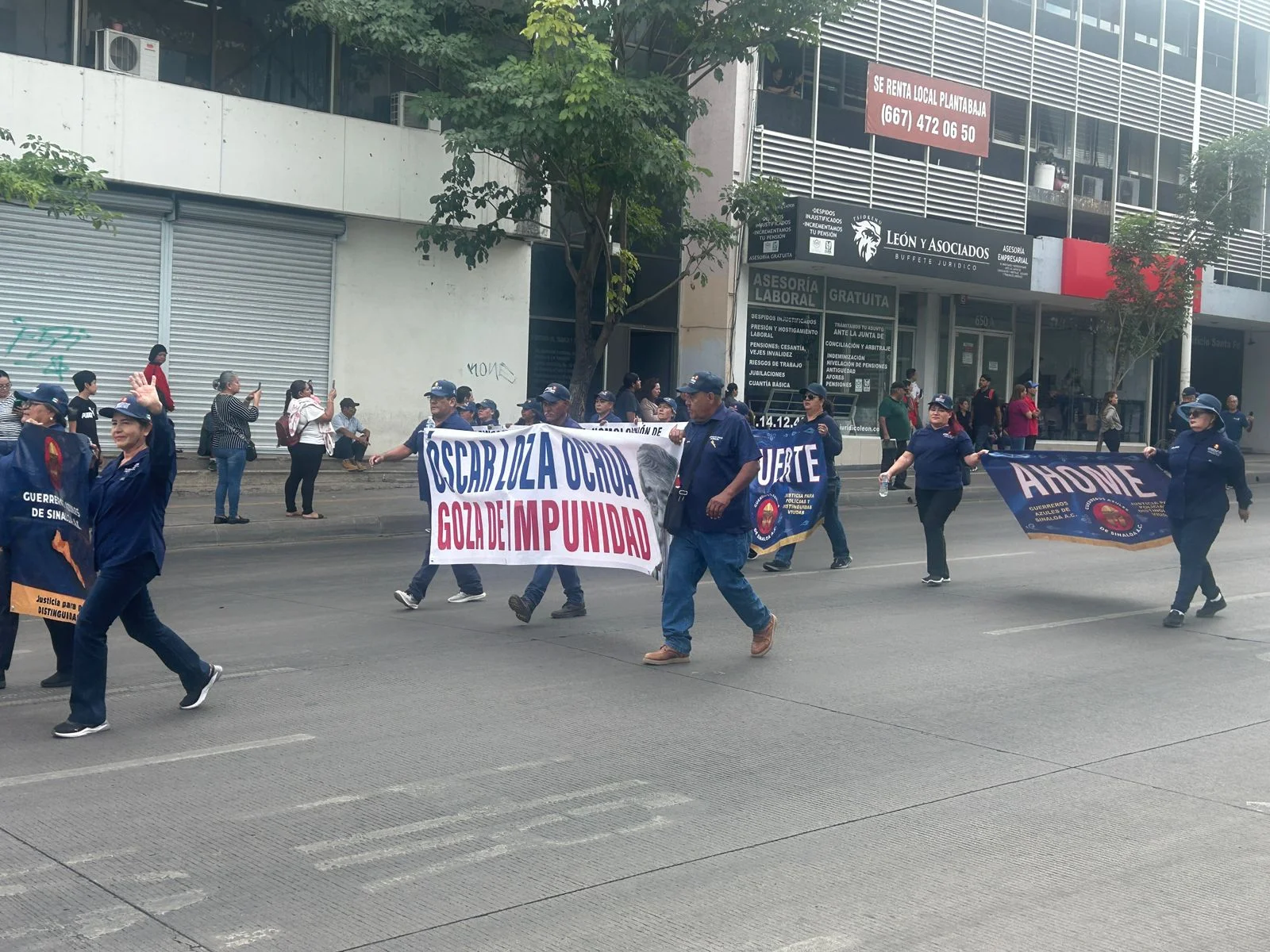 Frente al gobernador, ya dentro del mismo recorrido del desfile, el colectivo Guerreros Azules, integrado por policías activos, jubilados y viudas de elementos, se manifestó directamente frente a él durante su paso por el Ayuntamiento. Yesenia Rojo, lideresa del colectivo, tomó un micrófono y levantó la voz para exigir justicia, el pago de sueldos dignos, pensiones para las viudas de policías caídos y atención a la denuncia que interpusieron contra el presidente de la Comisión Estatal de Derechos Humanos, Óscar Loza Ochoa.