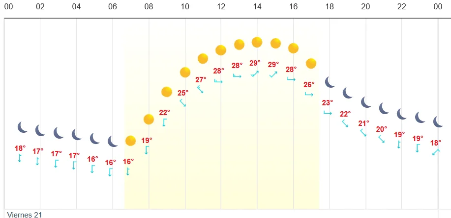 En cuanto a los vientos, se mantendrán suaves, con rachas de apenas 6 kilómetros por hora, una brisa débil que podría aumentar a 8 kilómetros por hora durante las últimas horas de este viernes. Estas variaciones no representan un factor relevante en las temperaturas registradas.