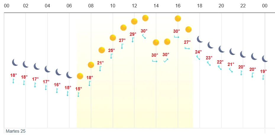 La sensación térmica será elevada debido a los niveles de humedad, estimados en un promedio del 55 por ciento, lo que provocará una ligera sensación sofocante durante las horas de mayor calor.