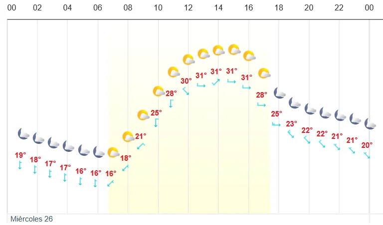 El Servicio Meteorológico Nacional (SMN) informa que la temperatura más alta pronosticada para hoy será de 31 grados centígrados. Por otro lado, el clima descenderá hasta los 14 grados durante la noche, una temperatura proyectada para las siguientes dos noches.