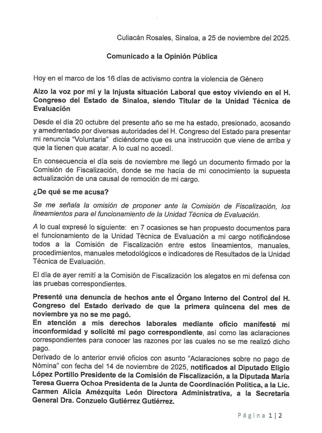 Culiacán, Sin.- En pleno marco de los 16 días de activismo contra la violencia de género, la funcionaria del H. Congreso del Estado, Alejandra Pineda Prado, titular de la Unidad Técnica de Evaluación, alzó la voz para denunciar lo que califica como una serie de presiones, hostigamiento laboral y represalias institucionales por parte de las autoridades de la comisión de Fiscalización.