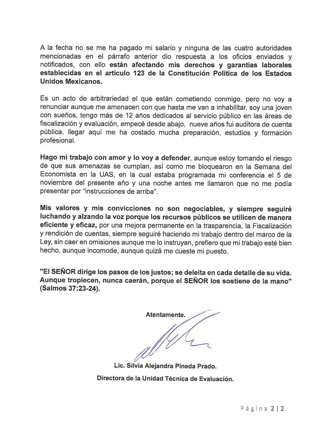 Pineda asegura que también ha recibido advertencias sobre una posible inhabilitación si no accede a renunciar. A ello suma otro episodio: la cancelación de una conferencia que impartiría en la Semana del Economista en la UAS, donde, según le informaron, no podría presentarse por “instrucciones de arriba”.